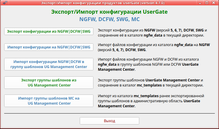 Программа предназначена для переноса конфигурации между SWG, DCFW и NGFW (версий 5, 6, 7) и МС версии 7.1 и выше.