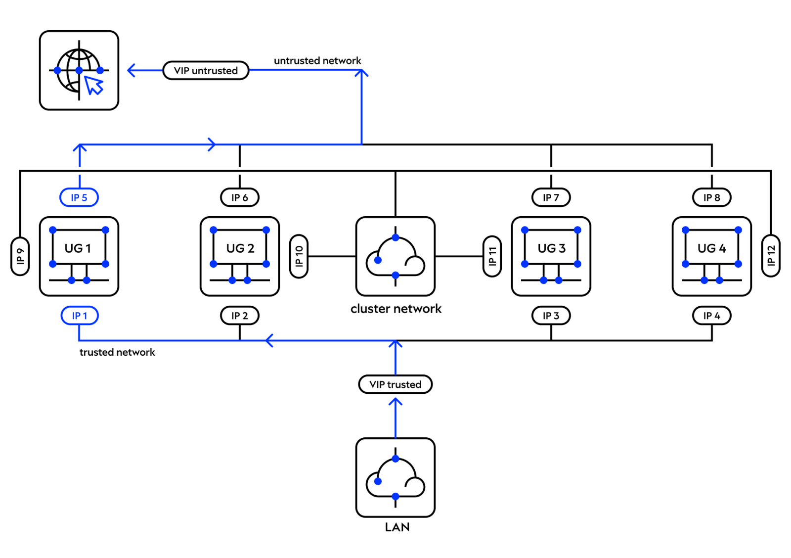 • Обмен служебным трафиком между узлами кластера выполняется в юникаст-режиме.