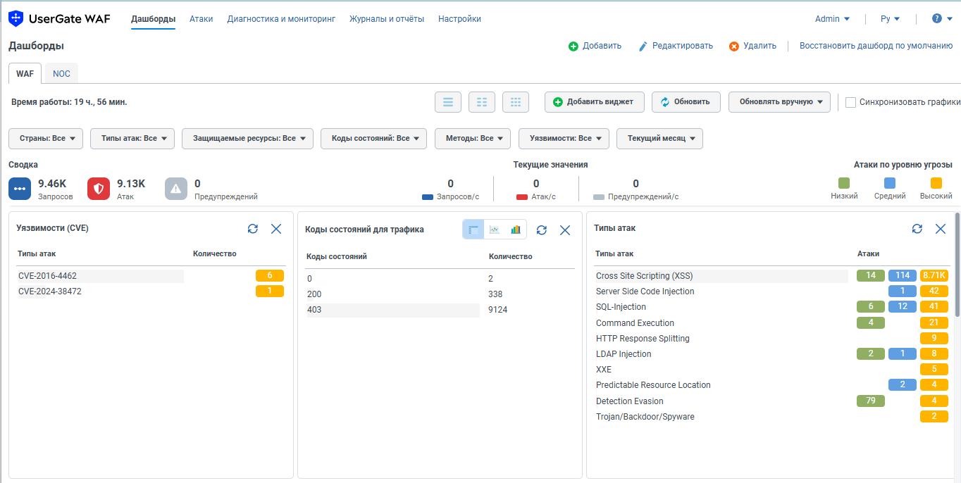 Вы можете добавлять новые дашборды, переименовывать их и удалять, выбирать нужные виджеты из поставляемых с продуктом коллекций, изменять состав виджетов на дашбордах, их расположение и размер. В UserGate WAF есть два типа дашбордов: