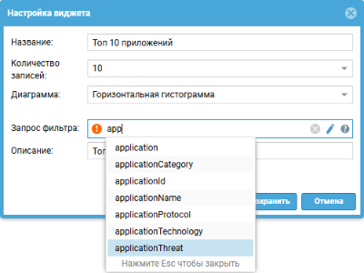 Чтобы по виджету можно было отслеживать только опасные приложения, необходимо в окне Настройка виджета в поле Запрос фильтра настроить дополнительную фильтрацию данных с помощью SQL-запроса. В SQL-запросах используется тот же синтаксис, что и в журналах для поиска и фильтрации данных. Ключевые слова и операторы, а также примеры их использования можно посмотреть в разделе документации «Поиск и фильтрация данных». Значения параметров собираются из событий в журнале. При вводе запроса в поле отображается список доступных операторов, параметров и их значений, из которых можно сформировать нужный запрос.