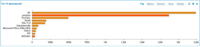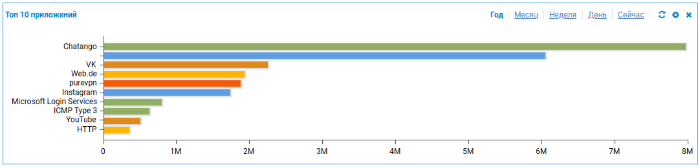 Пример фильтрации данных в виджетеНа дашборд добавлен виджет Топ-10 приложений, в котором по умолчанию представлены разные приложения, в том числе не представляющие угрозы.